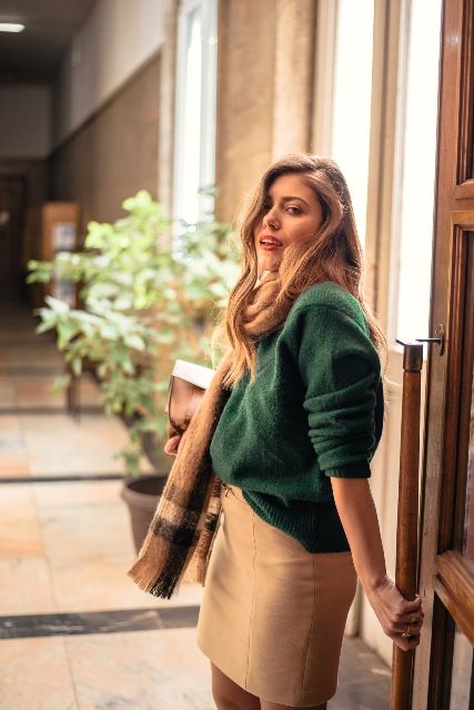Los outfits de otoño con falda beige son ideales para la transición de estaciones. Combina la falda con medias tupidas y botines para mantenerte abrigada y con estilo durante el clima más fresco.
