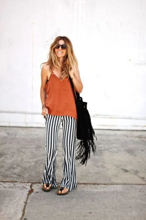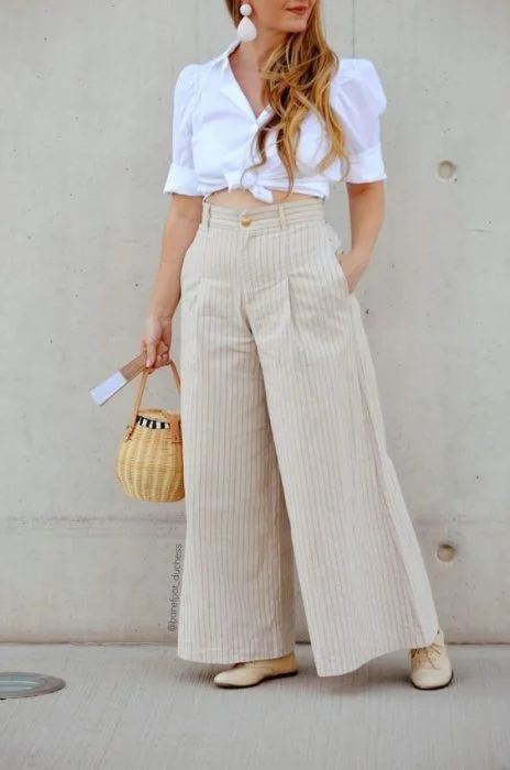 Si prefieres algo más atrevido, los pantalones palazzo de rayas verticales son una excelente opción, ya que no solo se ven hermosos, sino que también tienen un efecto visual de adelgazamiento. Para combinarlos, opta por un top o blusa en un tono sólido y asegúrate de que el largo termine justo en la línea de la cintura para lograr un efecto estilizado.